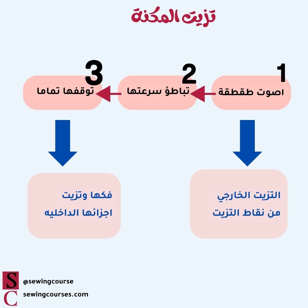 اذا سمعتي صوت"طقطقة"اثناء الخياطة فهءا اول مؤشر لاحتياجها لتزيت واذا اهملتيه فبتشعري بعد فترة ببدأ تباطؤها وتقل سرعتها وهني لازم تزيتيها ولو اهملتي التزيت