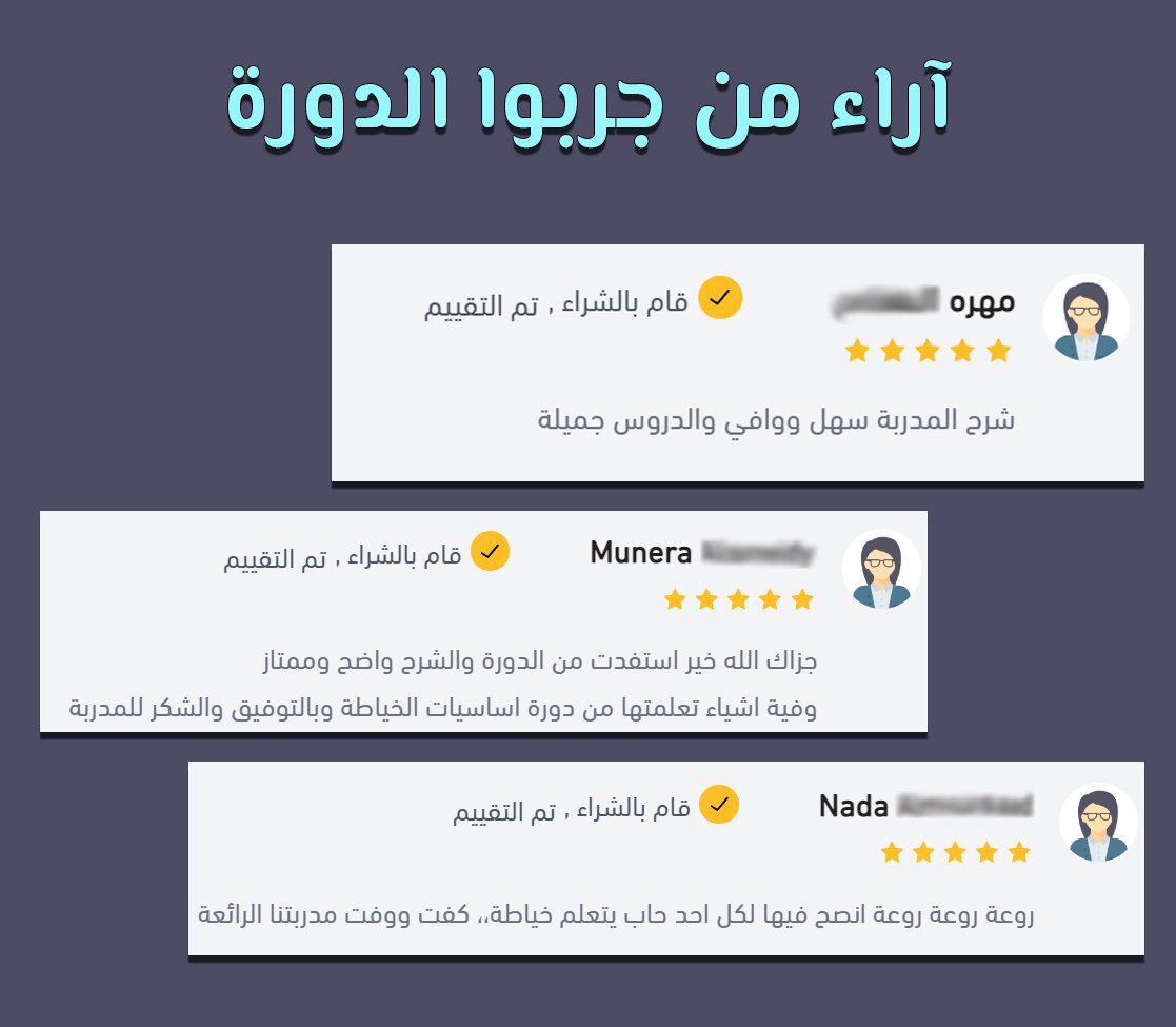 نحن نفتخر بحصول دورتنا على تقييمات بواقع 5/5 نجوم من المتدربات السابقات. هذا التقييم العالي يعكس جودة المحتوى وفعاليته، مما يجعل دورتنا الخيار الأمثل لكل من يرغب في تعلم الخياطة بإتقان.